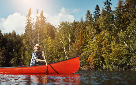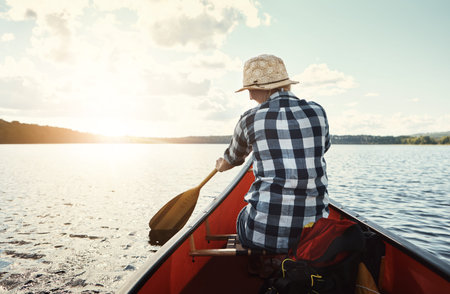 A young man paddles across a calm lake at sunset. The warm light creates a serene and peaceful atmosphere.