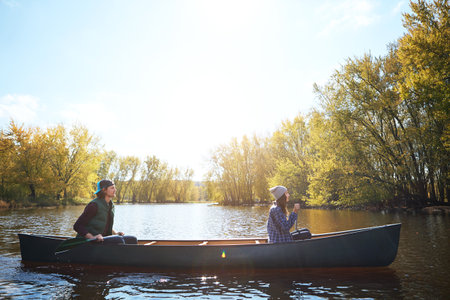 This is where they go to relax. a young couple going for a canoe ride on the lake.