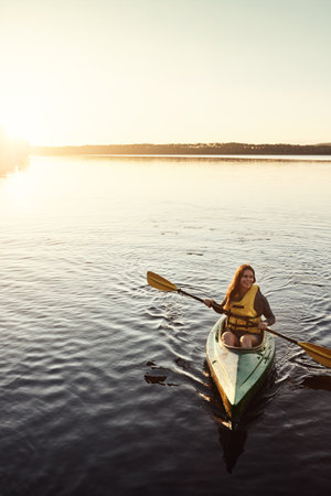 Theres no better activity in the world. a young woman out kayaking on a lake.
