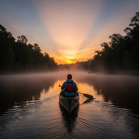 A person rows a small boat on a calm, foggy lake at sunrise, surrounded by nature's tranquility.