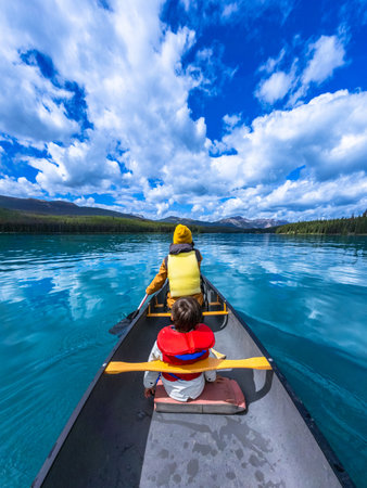Tourists paddling a canoe on beautiful Maligne Lake in Jasper National Park, Alberta, Canada, enjoying a sunny day surrounded by stunning nature