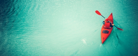 Kayaking Down the River. Caucasian Men in Red Kayak. Panoramic Photo with Left Side Copy Space. Water Sports and Summer Recreations Theme.