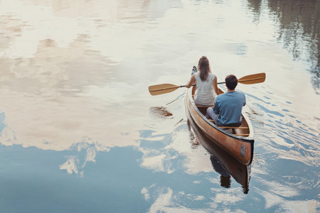 Two people canoeing together on a serene lake, surrounded by beautiful reflections under a colorful sky.