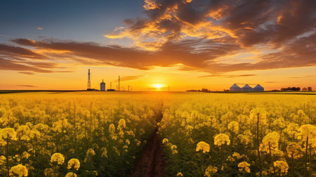 Agricultural rapeseed field at flowering sunset or sunrise. Rural landscape.