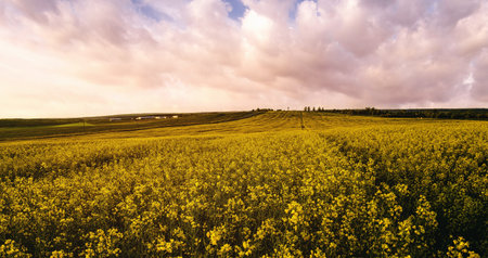 Yellow bright flowers in a bloom in a field of rapeseed at sunset light, creating a beautiful summer landscape. Agricultural business concept image. Vintage film aesthetic.