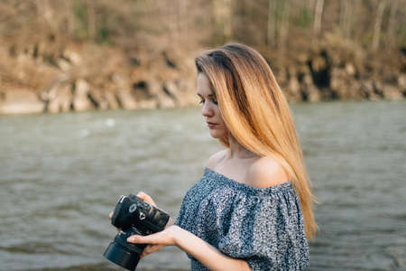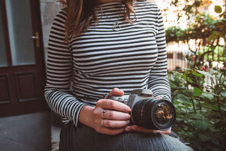 Woman with camera outdoors. Girl takes pictures. Hobby, leisure or profession