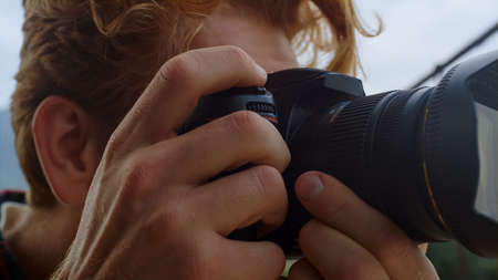 Closeup photographer face take picture on photo camera. Unknown redhead tourist filming nature. Traveling videographer hands hold digital device outdoors. Hiker shooting travel blog. Tourism concept.