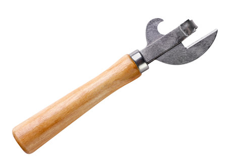 Kitchen utensils. Modern can opener, tin can. Close-up, copy space.