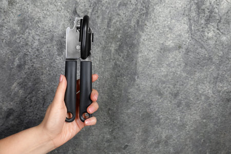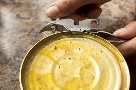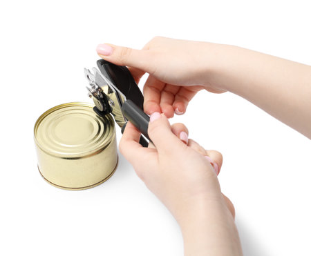 A close-up captures human hands using a modern stainless steel can opener to effortlessly open a sealed tin food can. This common kitchen task highlights convenience and domestic life at home.