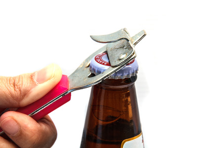 old can opener shot on a red background with a place for an inscription. bottle opener on red background