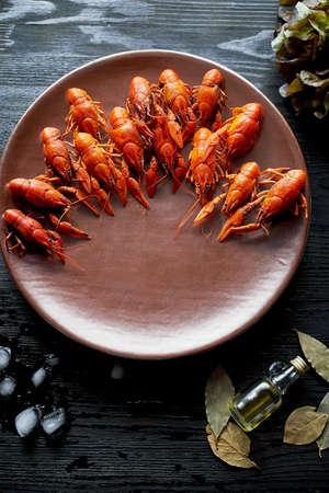 boiled crayfish on a white plate on a black background