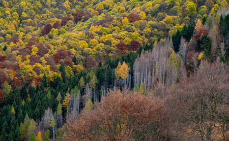 Texture background of autumn forest in mountains. Fall colored natural view.