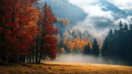 A stunning landscape photograph capturing the vibrant colors of autumn in a mountain forest, with mist adding depth.