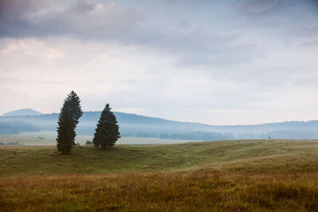 fog rises quietly among the trees and meadows in the beautiful mountains of the Asiago plateau near Vicenza, Italy.