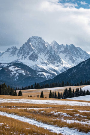 Grassland forest scenery under the snow mountain