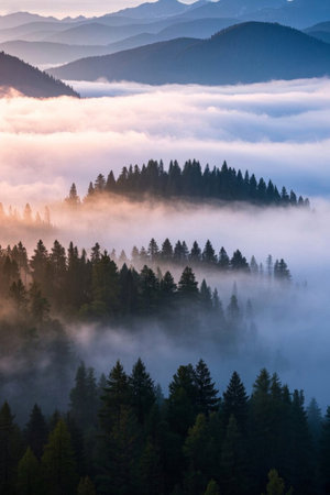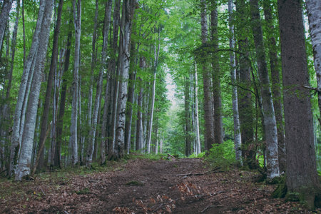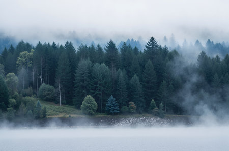 beautiful forest landscape, misty morning, scenic nature with fog