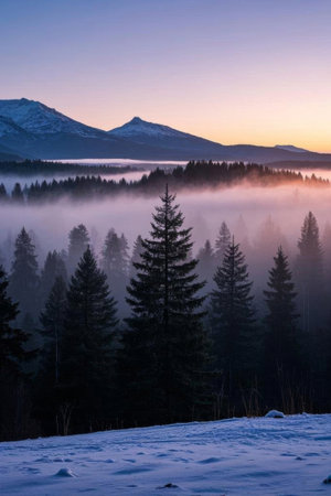 Snow covered mountains and forests and distant mountains sunrise scene