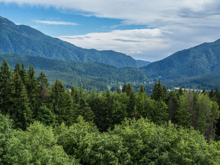 Beautiful landscape with coniferous forest in the mountains. Selective focus.