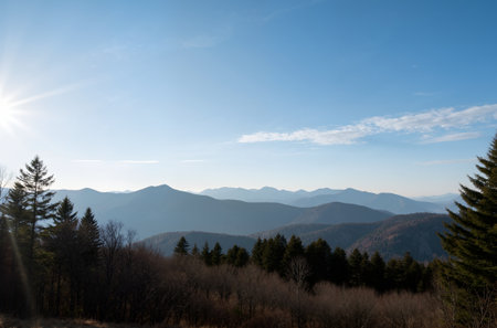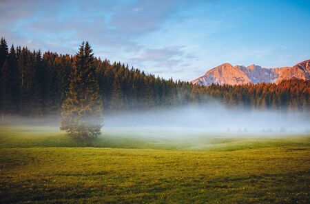 View of picturesque mountain valley with blue sky on background. Magnificent highlands with colorful trees and hills covered with dense fog. Concept of nature and rolling hills.