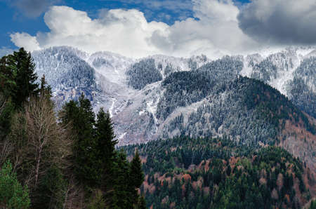 View of mountains with snow-covered pines and autumn colored trees. Use for background, backdrop or design element in natural concept.