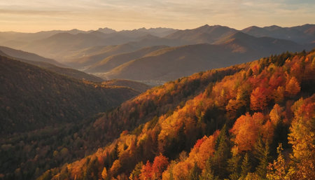 Autumn mountain landscape. Colorful forest in the mountains at sunset.