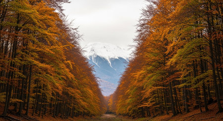 Mountain showing autumn forest avenue lined with vibrant orange and yellow trees leading to a snow-capped mountain...