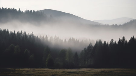 Green valley near foggy pine woodland. Whispers of fog: vibrant meadow stretches beneath misty forest, where evergreen and autumnal trees blend into rolling hills under dramatic, cloudy sky
