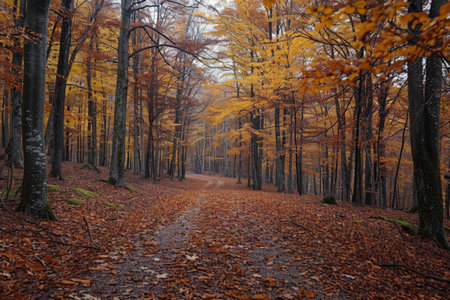 A tranquil forest path blanketed with colorful autumn leaves, surrounded by tall trees with vibrant fall foliage.