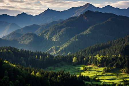 mountains in a coniferous forest in the morning. eco nature generative ai.