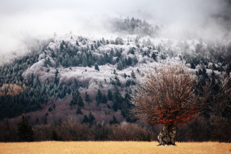 A lonely massive tree in the middle of an misty mountain meadow