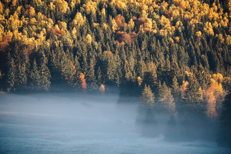 autumn nature background forest in fog
