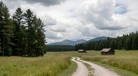 Mountain road through meadow with wooden huts and pine trees