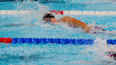 Focused male athlete swimming freestyle stroke in lane during intense competitive race, showing determination and power.
