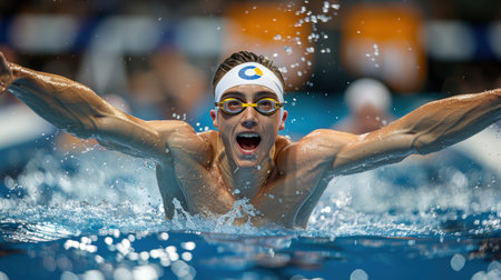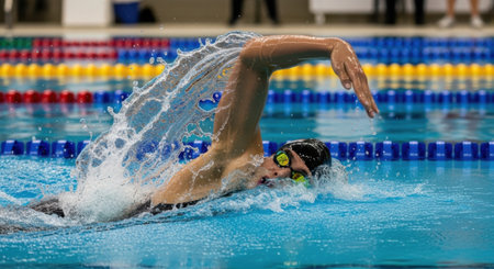 Competitive swimmer performs butterfly stroke in pool, showcasing strength and determination. Water splashes around, highlighting intensity of race and swimmer focus