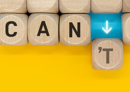 Motivational concept, concept of development, success. The wooden blocks say I can't. The hand removes the block labeled 't.
