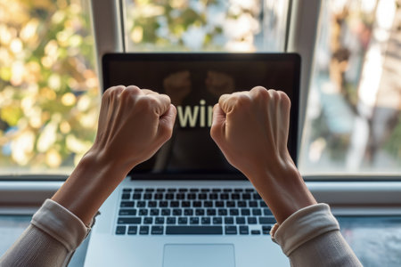 Man watching football online broadcast on his laptop and celebrate victory in betting at bookmakers website. Betting and gambling concept