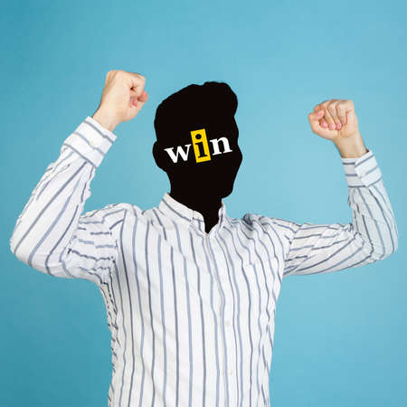 Conceptual portrait of faceless man with word win instead face. Human emotions, psychology, mental health concept.