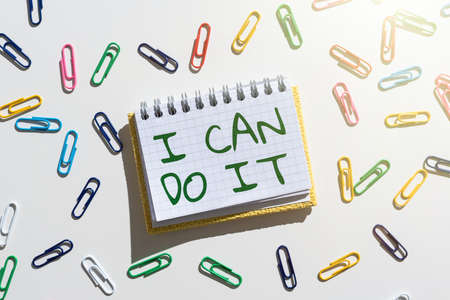 Writing displaying text I Can Do It. Word for ager willingness to accept and meet challenges good attitude Important Message Written On Notebook With Colorful Paperclips Around.