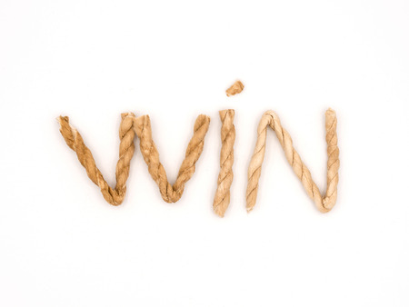 The word WIN is made of wooden cubes on a white background.