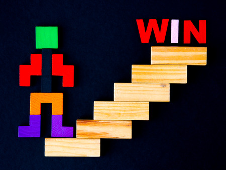 Concept of building success foundation. wooden block in the shape of human step on stacked wooden block like stairs to WIN. Business development and growth concept.
