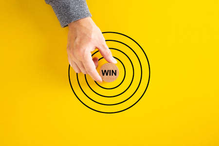businessman hand put round block with Win word aim at concentric circles of marketing target.
