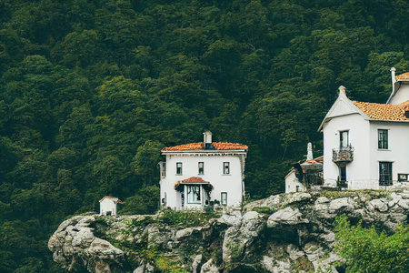 Picturesque view of Cabrales village nestled in lush green hills and dramatic limestone peaks of northern Spain, showcasing charming architecture and stunning mountainous landscape under a bright sky