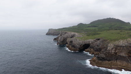 Dramatic cliffs and lush green hills meet the vast expanse of the Cantabrian sea along the rugged coastline of Asturias, Spain, creating a breathtaking vista