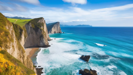 Stunning Coastal Scene with Rugged Cliffs and Turquoise Waves Crashing Below, Perfect for Travel