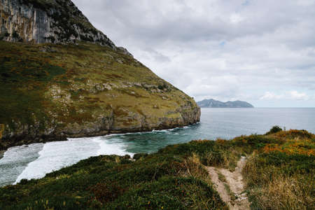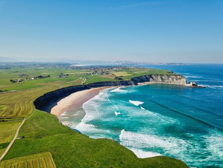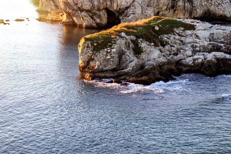 Seascape on a sunny day. Rocky sea coast. Aerial view of Buelna Bay and El Picon. Buelna, Asturias, Spain