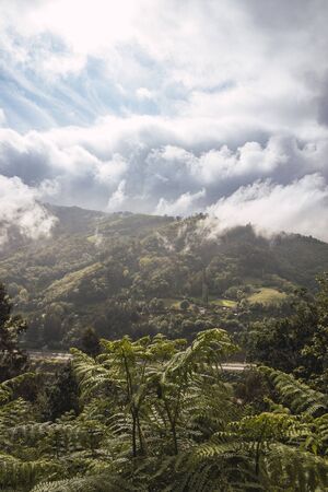 storm clouds perch on the green mountain of northern Spain. Relating to the environment and weather. Landscape of stormy day.