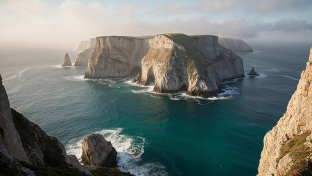 aerial view of a lush cliff and ocean, captured in the style of light green and light amber hues. the serene atmospheric perspective adds depth to the delicately rendered landscapes. this stunning photograph, taken with fujifilm pro 400h film, showcases the fantastical street created by kyffin williams and jessica rossier. ai generated
