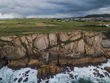 Aerial view of the rocky sea coast. The coast near the city of Buelna, Asturias, Spain