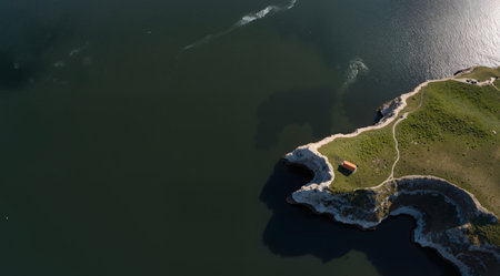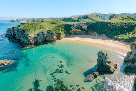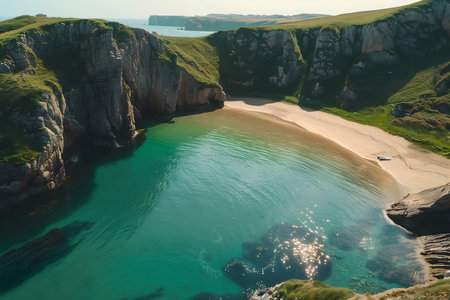 Beautiful aerial view of a hidden beach surrounded by majestic cliffs and turquoise waters. This secluded coastal scenery evokes serenity and offers a pristine, untouched nature escape ideal for scenic and relaxing retreats.