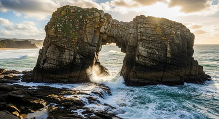 This breathtaking coastal image showcases towering rock formations and crashing waves, set against a vibrant blue sky, creating a serene yet dramatic landscape.